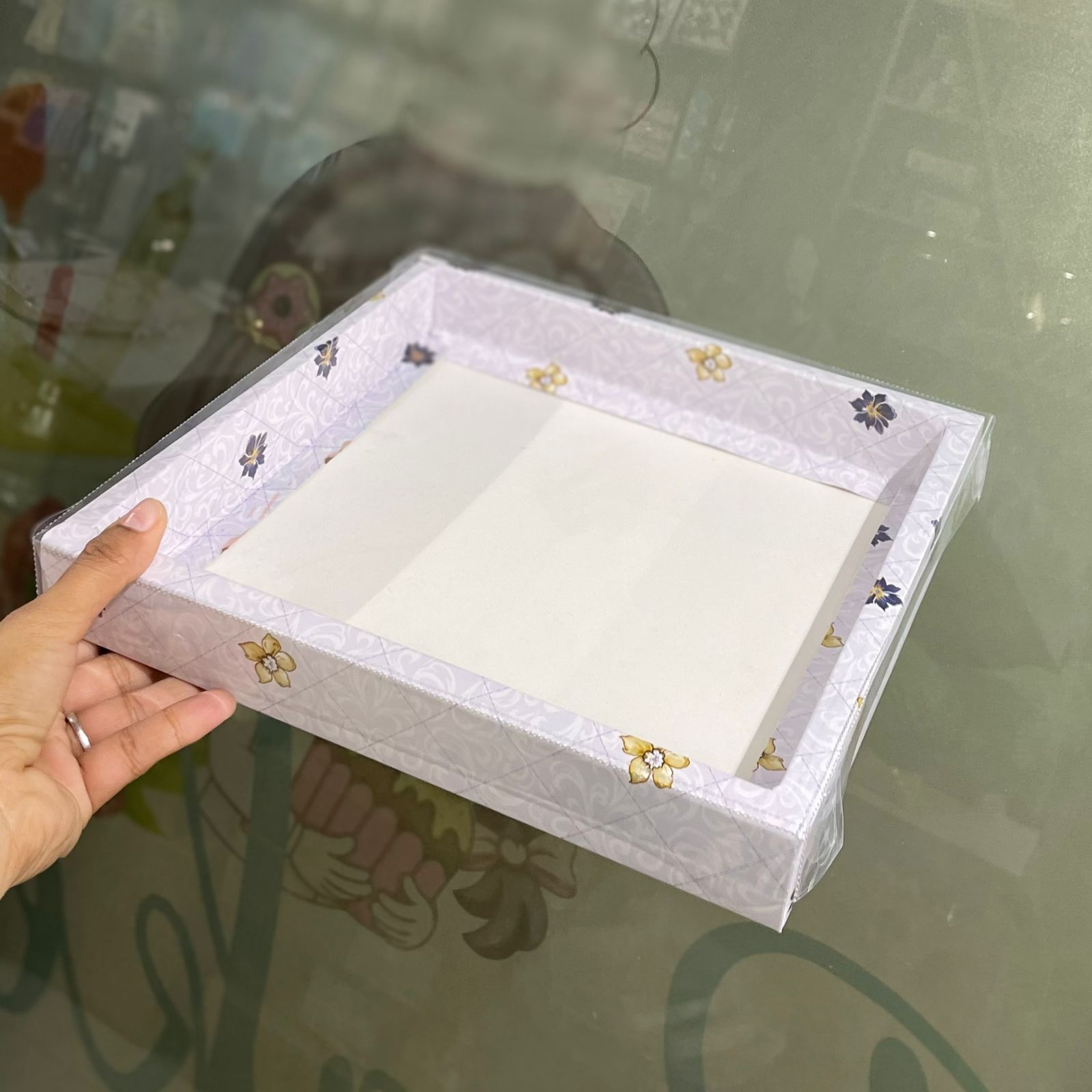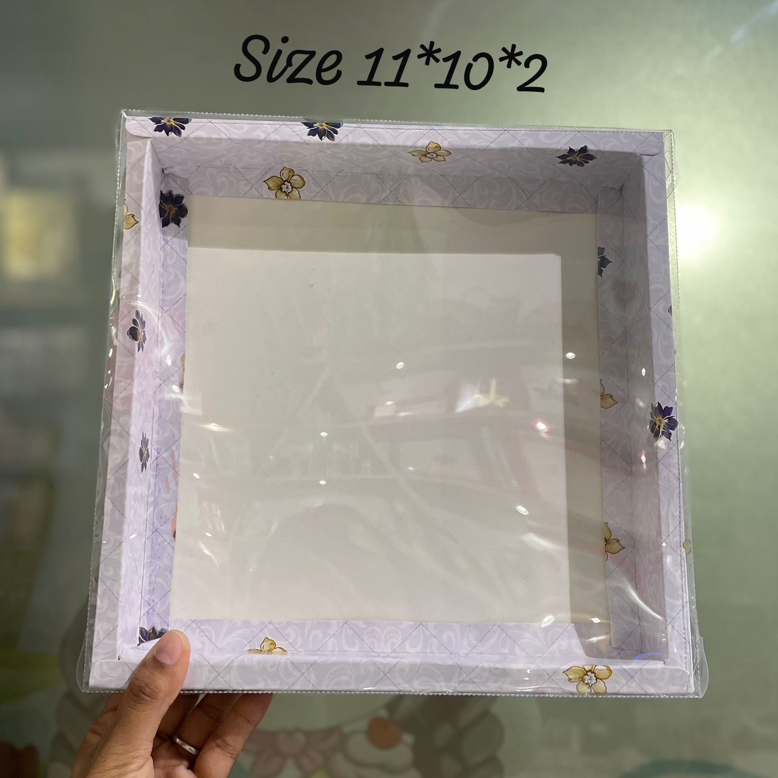 This 11×10×2 inch hamper box is a sleek and spacious packaging option, ideal for creating elegant gift hampers and bakery assortments. Its wider surface allows neat placement of multiple items while keeping a premium, presentable look.