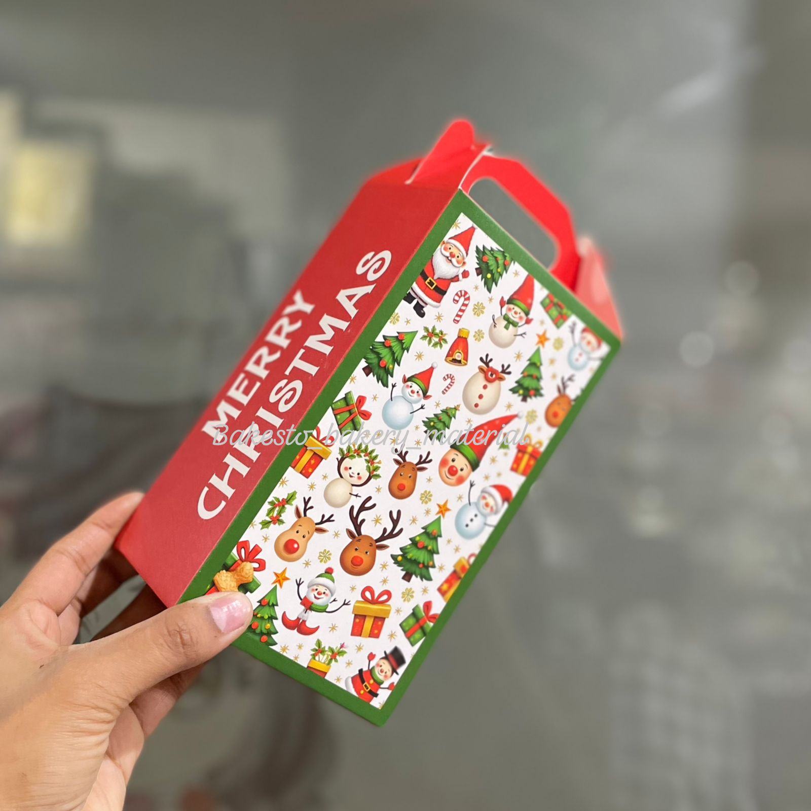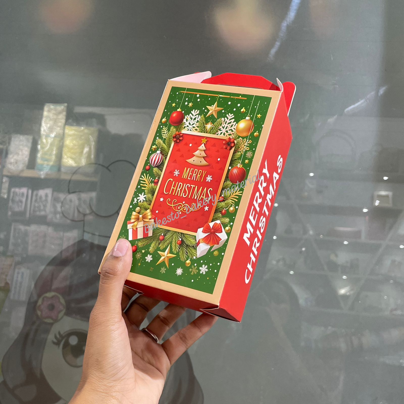 This is a festive green and red Christmas-themed gift box featuring an illustration of Santa Claus carrying a sack of presents, standing beside a decorated Christmas tree with gifts around. The background shows a snowy night sky with stars and reindeer flying near the moon. The box has the text “Merry Christmas” printed on it.